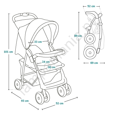 • O carrinho possui uma barra frontal em formato de tabuleiro que permite à criança pousar uma garrafa ou um lanche durante o passeio.