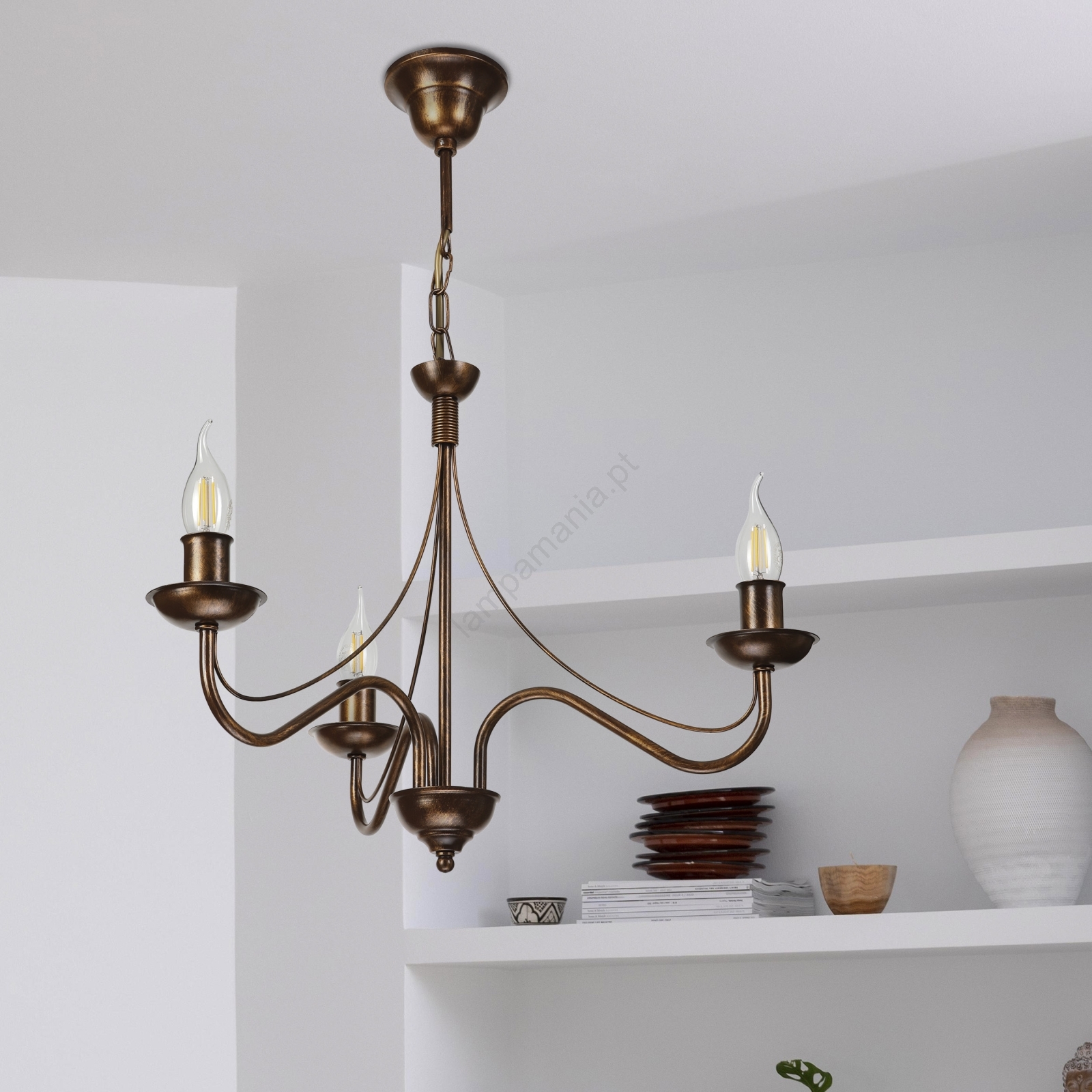 Lustre com corrente ANTON, 3x E14/15W/230V, acabamento bronze caracteriza-se por um design agradável e funcional.  Uma lâmpada com casquilho E14 é adequada para a iluminação Aqui, pode comprar outras lâmpadas a preços vantajosos. Terá um complemento interessante para a sua casa.