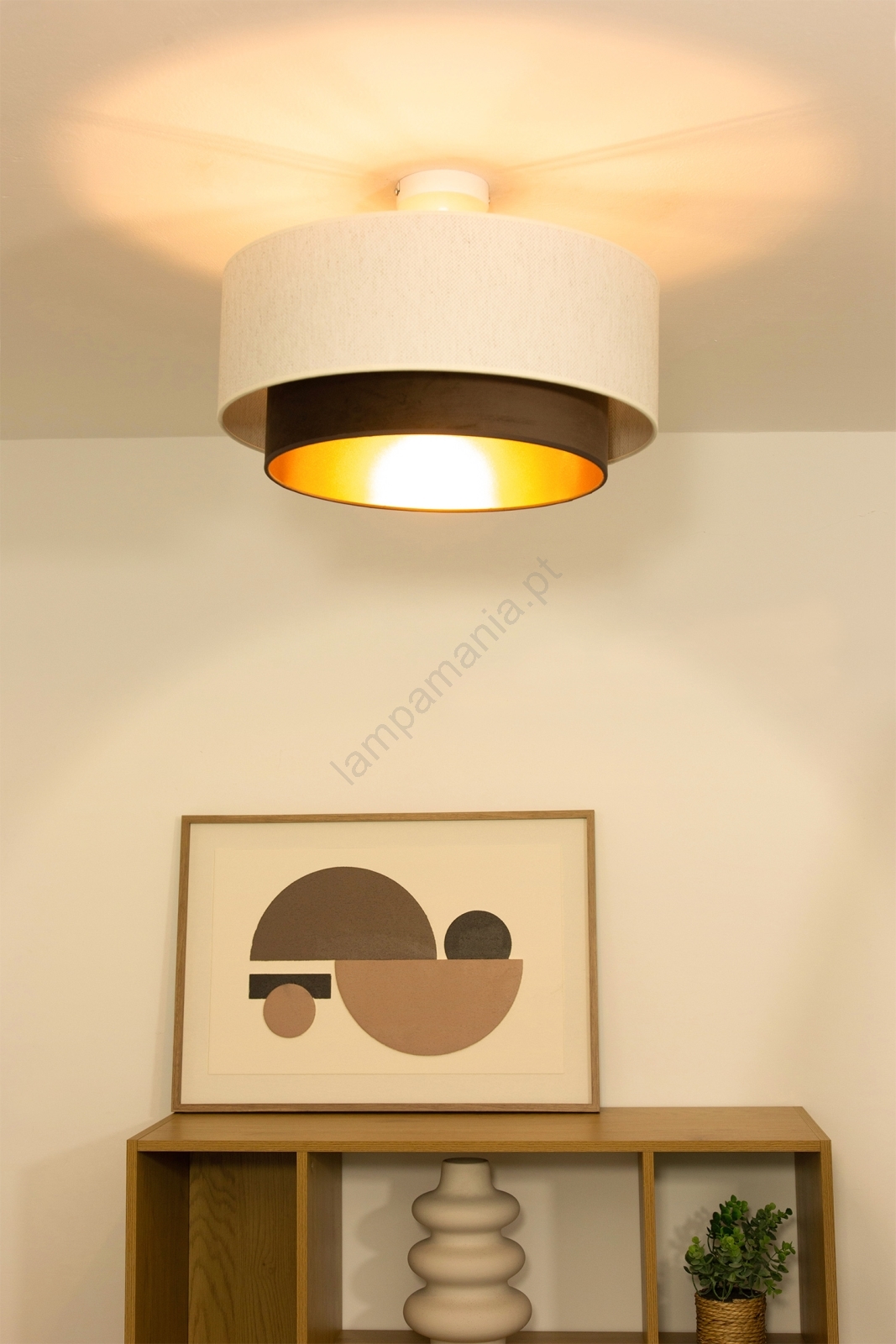 Lustre de teto sobreposto NATIA 1xE27/60W/230V branco/marrom caracteriza-se por um design agradável e funcional.  Uma lâmpada com casquilho E27 é adequada para a iluminação Aqui, pode comprar outras lâmpadas a preços vantajosos. Terá um complemento interessante para a sua casa.