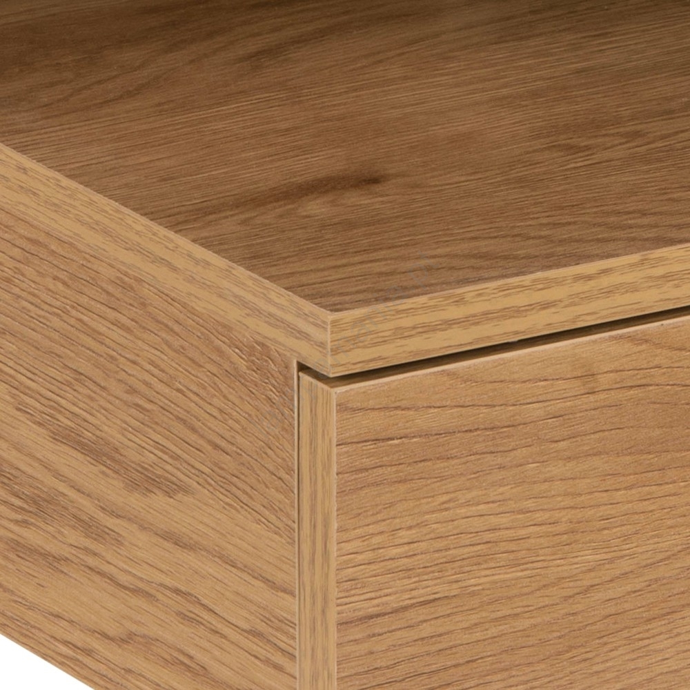 • Tampo, estrutura, gaveta e prateleira em acabamento craft fosco, extensão total, compartimento aberto e montagem na parede.