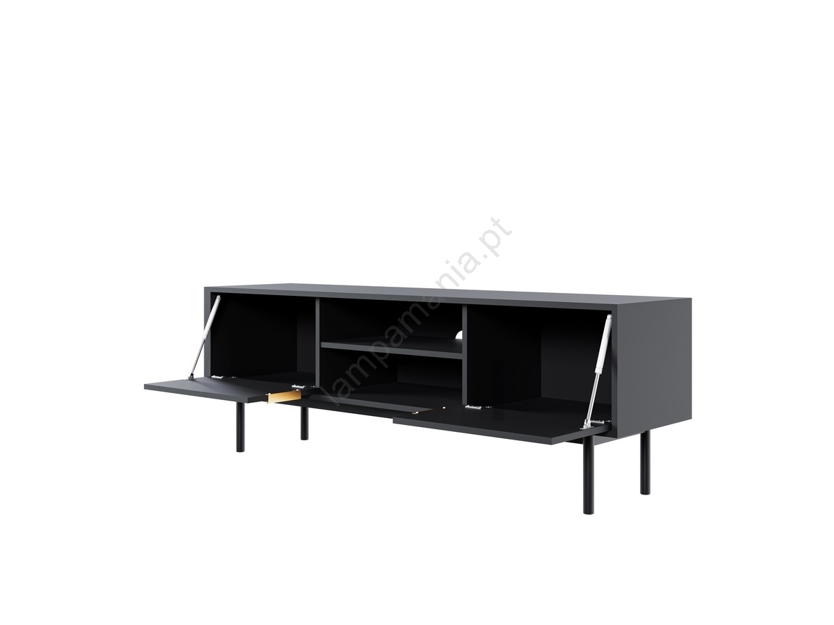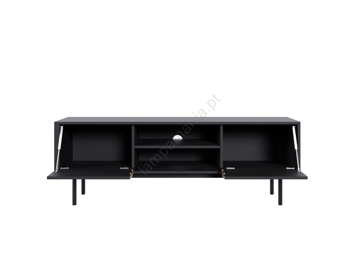 • Dispõe de dois compartimentos laterais fechados e duas prateleiras abertas, uma delas com orifício para cabos, na parte central.
