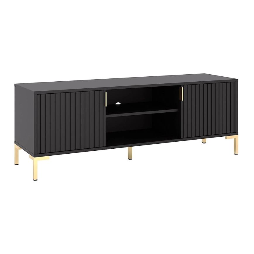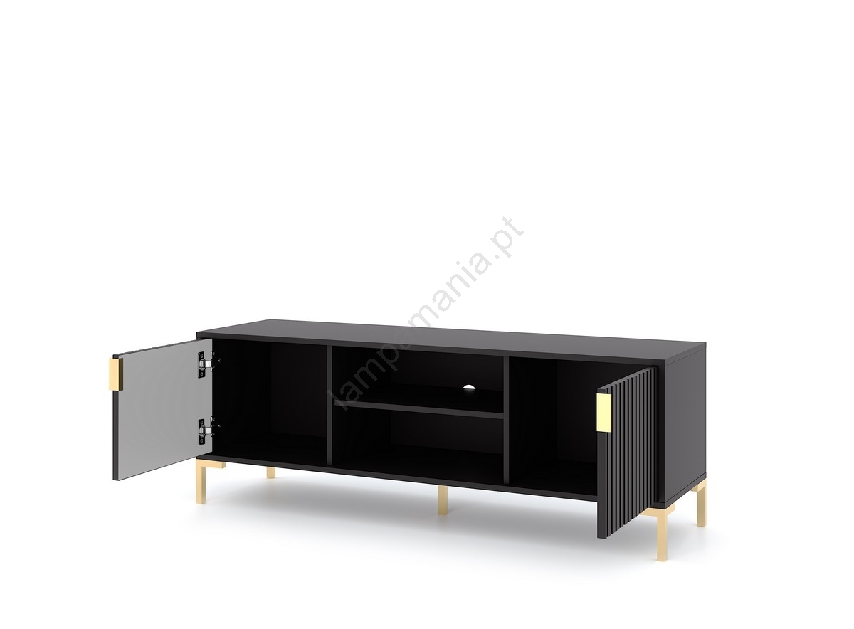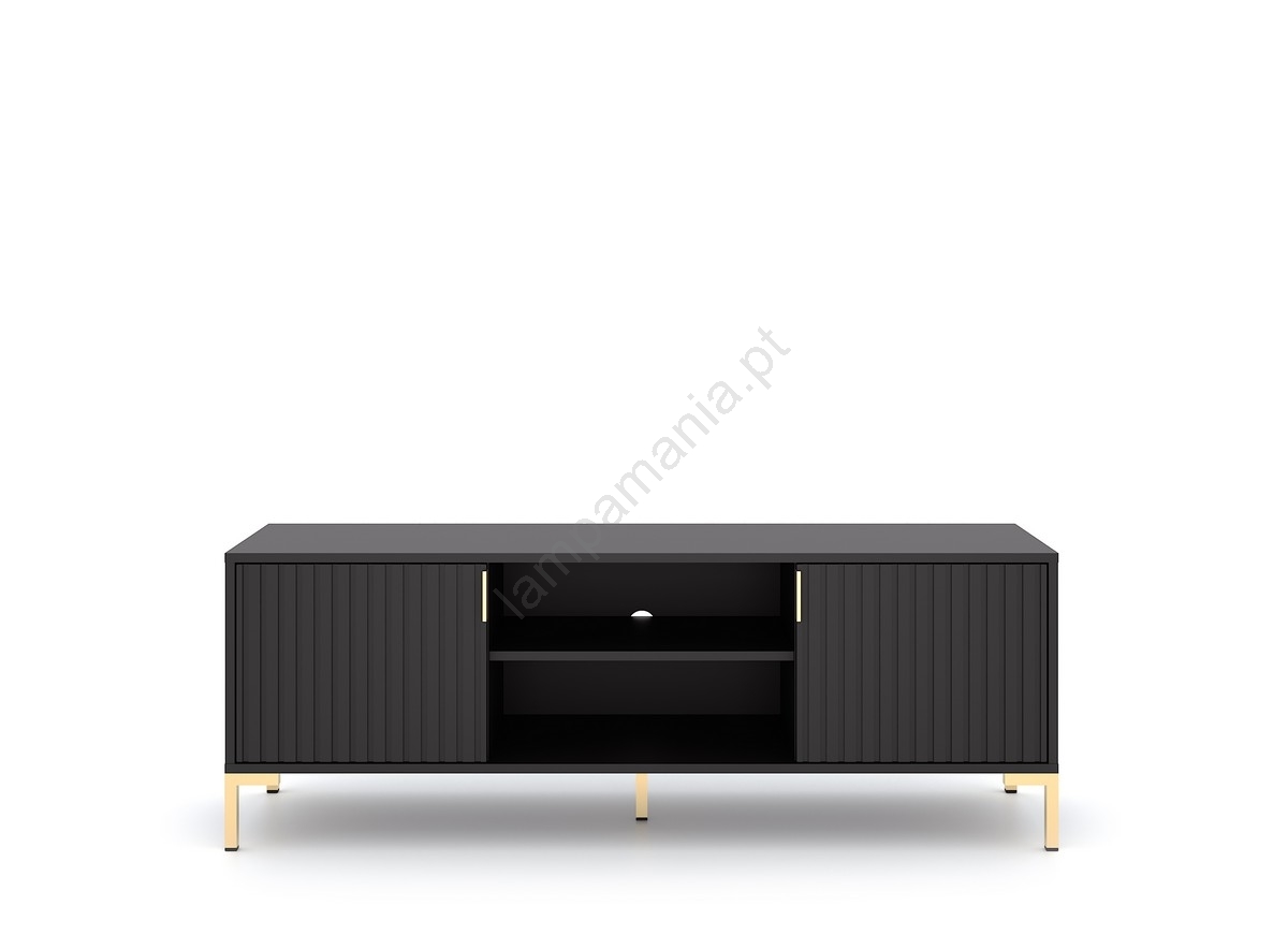 • Dispõe de dois compartimentos laterais fechados, cada um com portas com puxadores simétricos e frisos, além de duas prateleiras abertas com um orifício para cabos no centro.