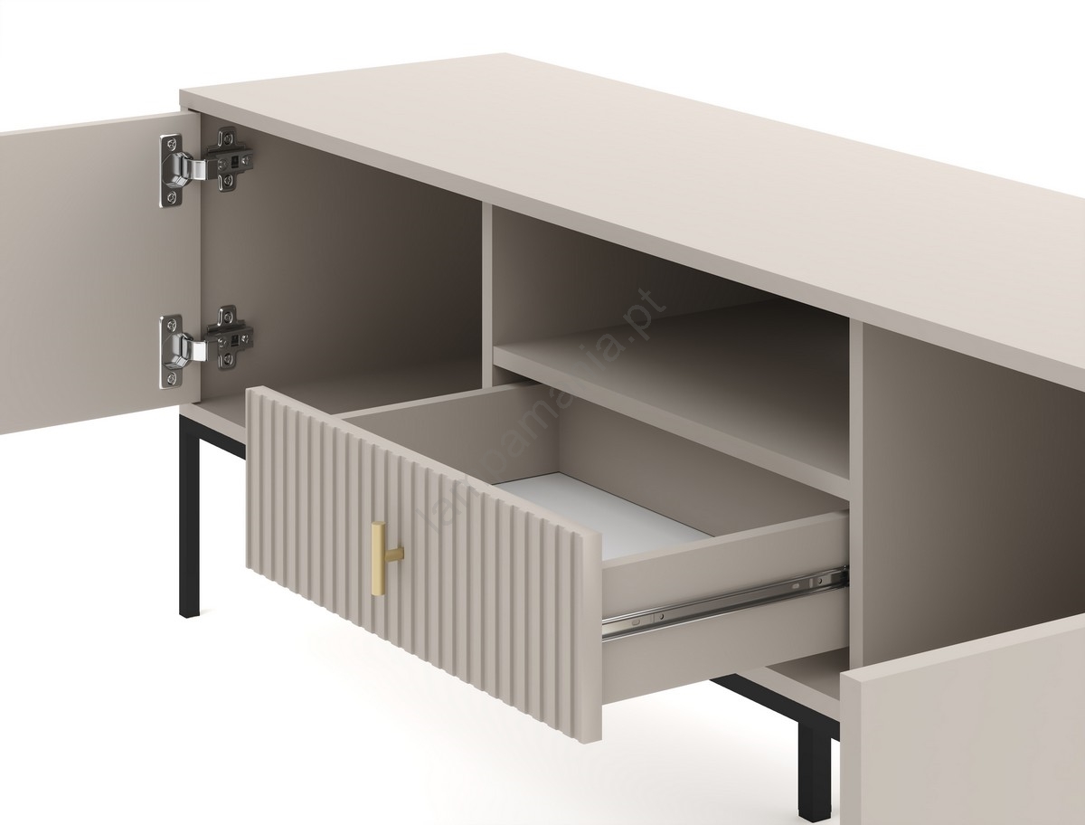 • Possui dois compartimentos laterais fechados, uma prateleira aberta com um orifício para cabos no centro e uma gaveta sob a prateleira com frente estriada.
