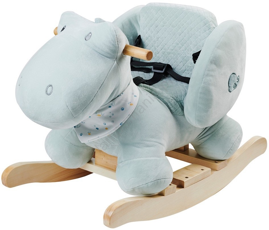 • Bonito crocodilo de pelúcia com base de madeira e alças, um brinquedo que convida a balançar e acariciar.