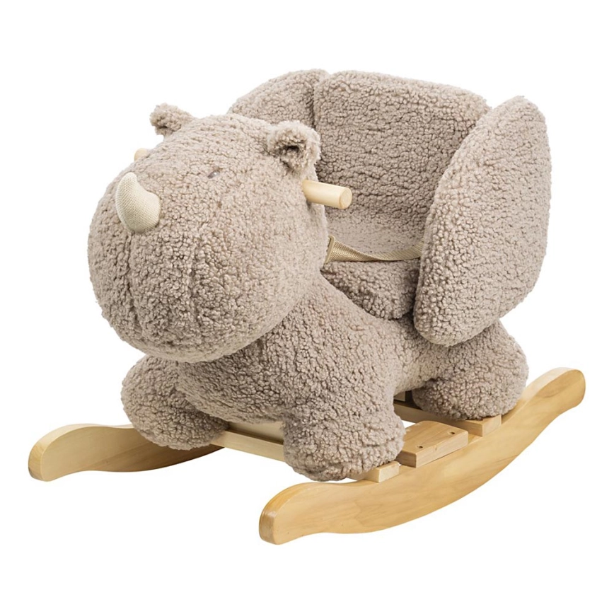 • Encantador rinoceronte de pelúcia com base de madeira e alças, um brinquedo que convida a balançar e acariciar.