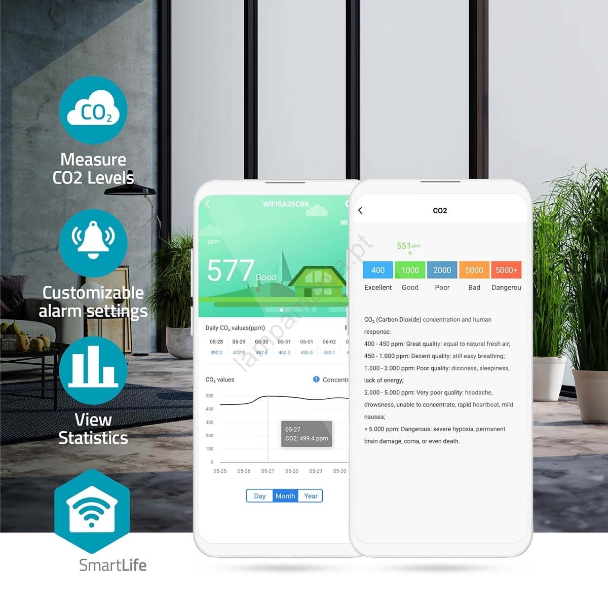 • Envia automaticamente notificações para o aplicativo SmartLife (compatível com iOS e Android) quando a concentração de CO2 no ambiente ultrapassa o limite configurado do alarme.