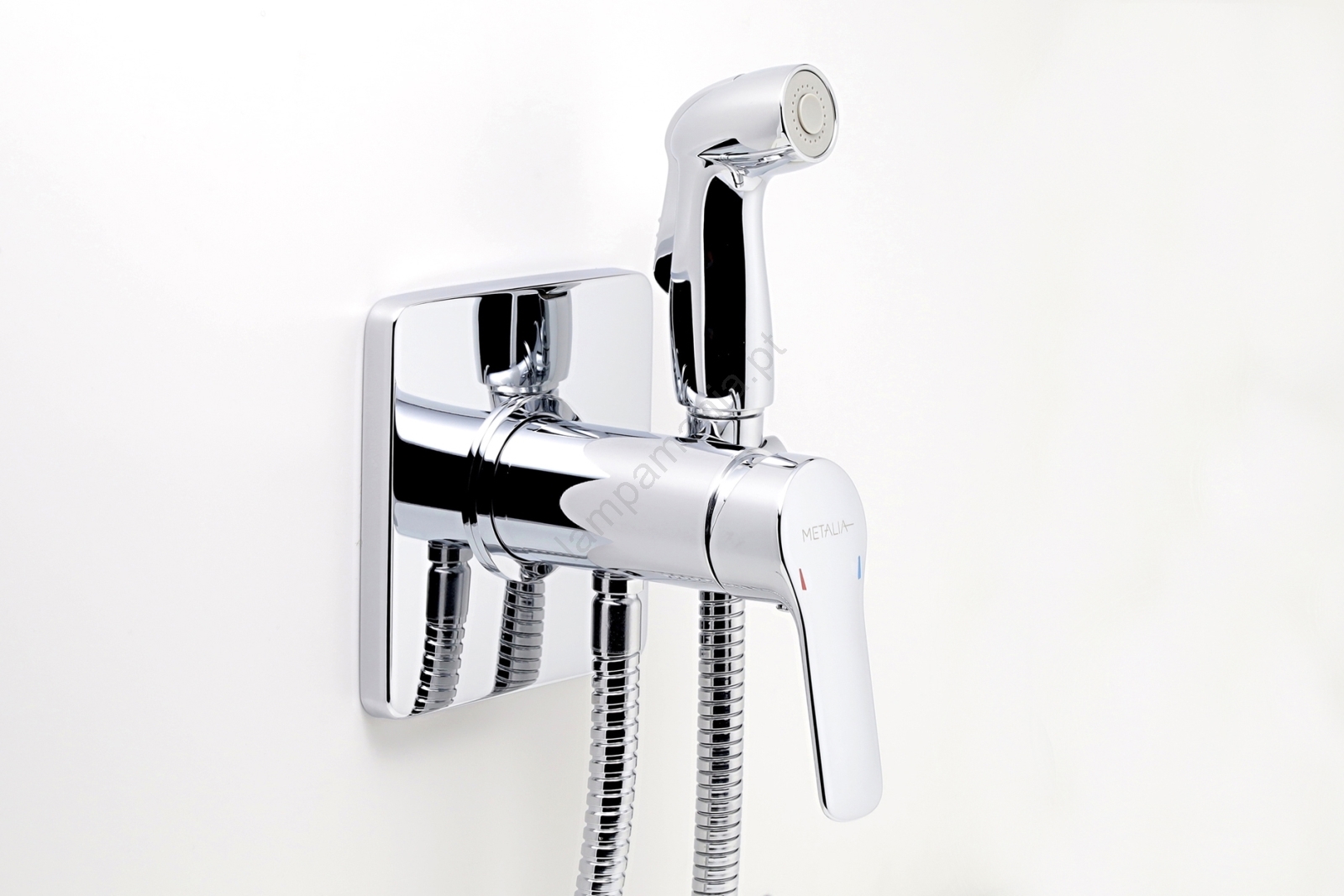 • O pacote inclui: torneira de bidé embutida com suporte para ducha, mangueira metálica, cabeça de chuveiro com válvula de paragem, ligação embutida 1/2" com válvulas antirrefluxo.