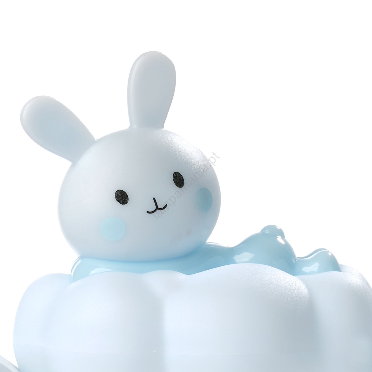 • La Nuvolina Celeste Bunny é uma adorável luz noturna em forma de coelhinho azul sentado numa nuvenzinha branca.