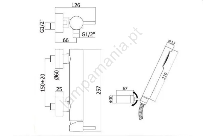 • O conjunto inclui o misturador, o duche de mão, o flexível de duche e o suporte.