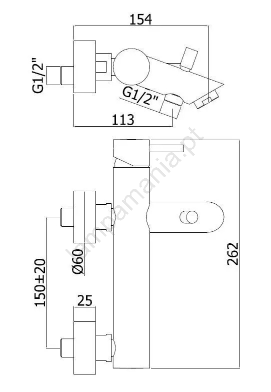 • Misturador monocomando de parede para banheira.