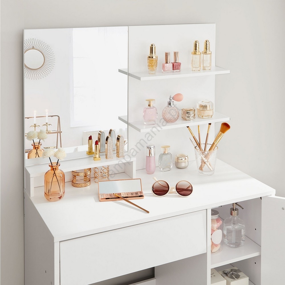 • A gaveta, o armário e as prateleiras mantêm os seus cosméticos e maquilhagem sempre à mão.