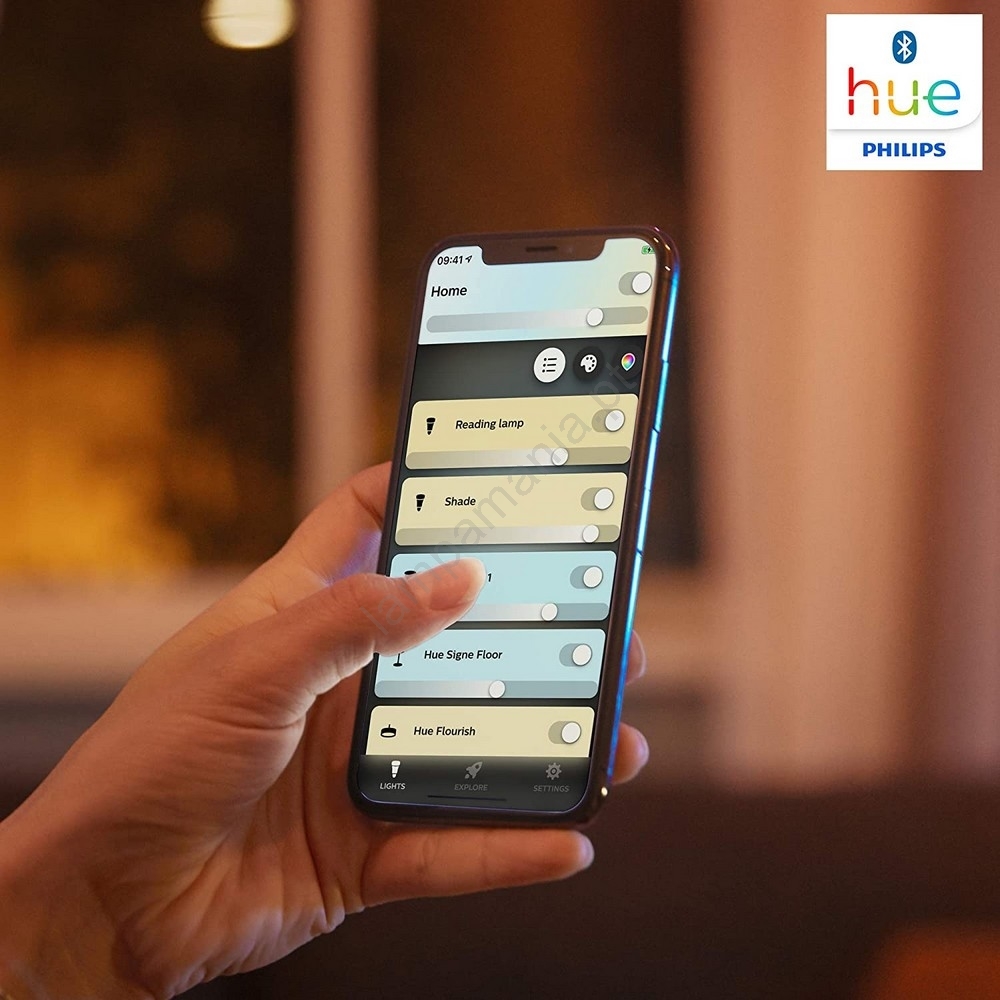 • Você pode controlar a luz diretamente pelo interruptor dimmer Hue incluso ou via Bluetooth.