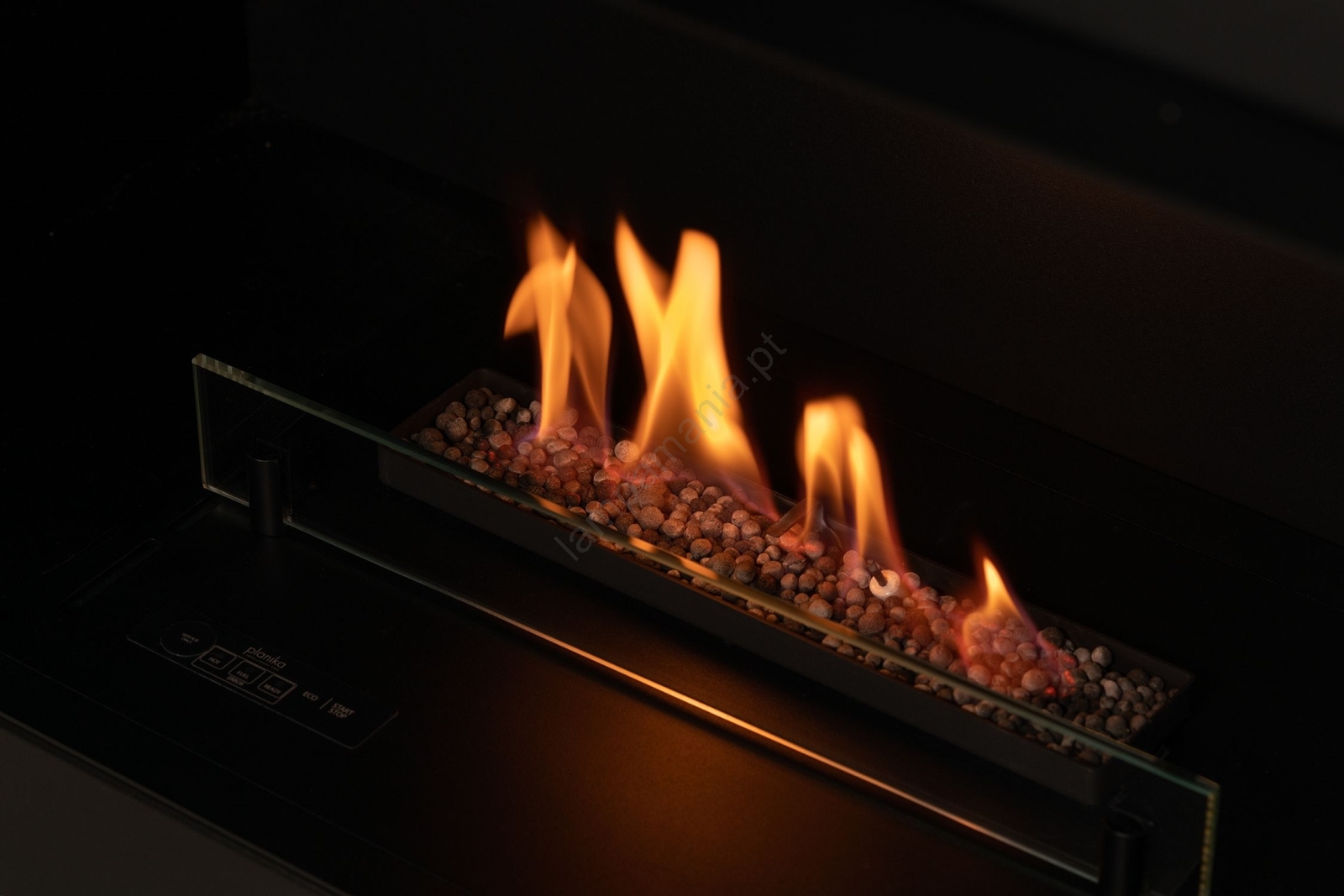 • O painel de controle permite ligar e desligar manualmente a lareira, alternar para o modo ECO e sinaliza quando o tanque de combustível está vazio, quando a lareira está pronta para ser ligada e quando está superaquecida.