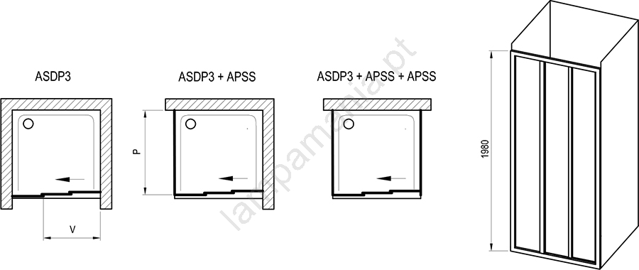 • Portas de duche em três painéis com painéis em plástico opaco.