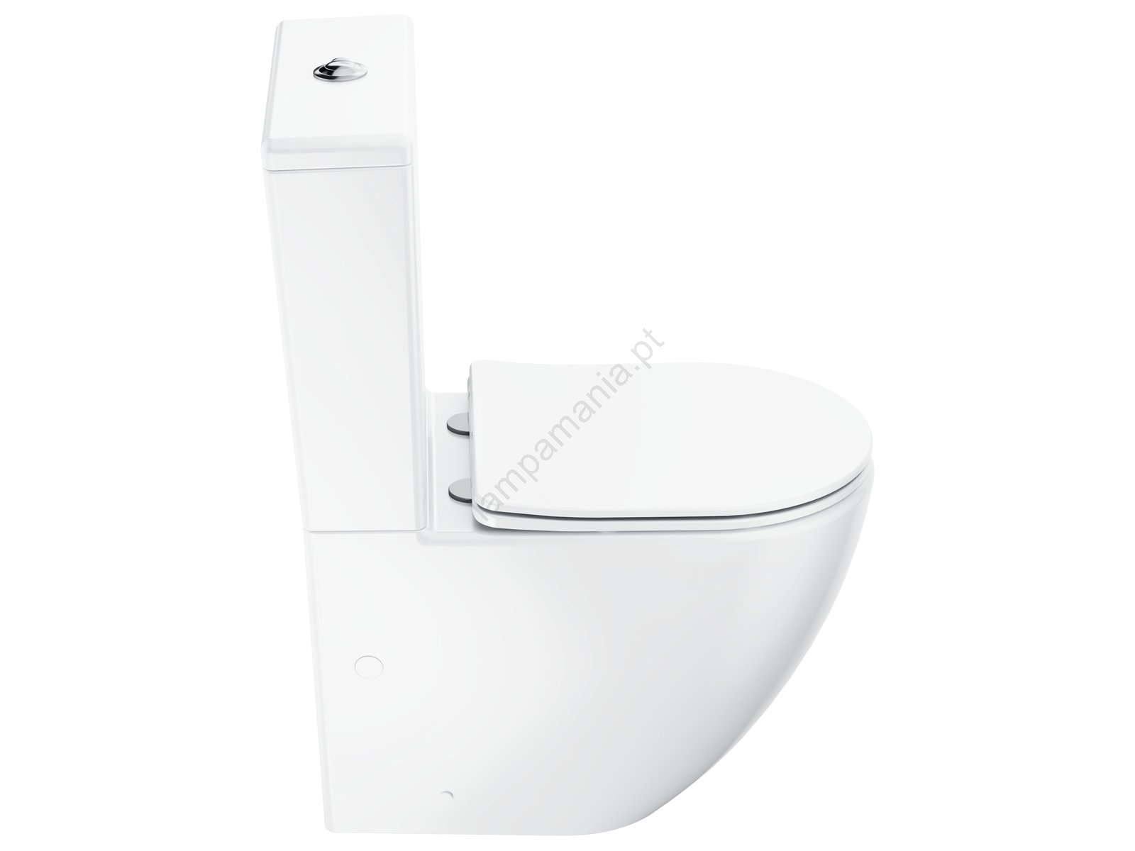 • O WC combinado independente Optima RimOff é fornecido em acabamento branco.