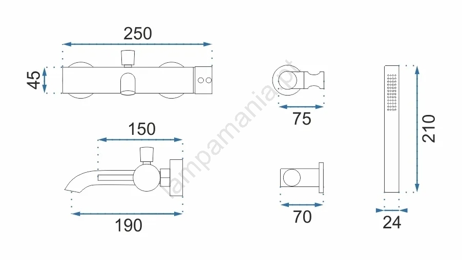• Conjunto inclui: bateria para banheira, chuveiro de mão, mangueira de duche (190 mm), suporte para chuveiro de mão.