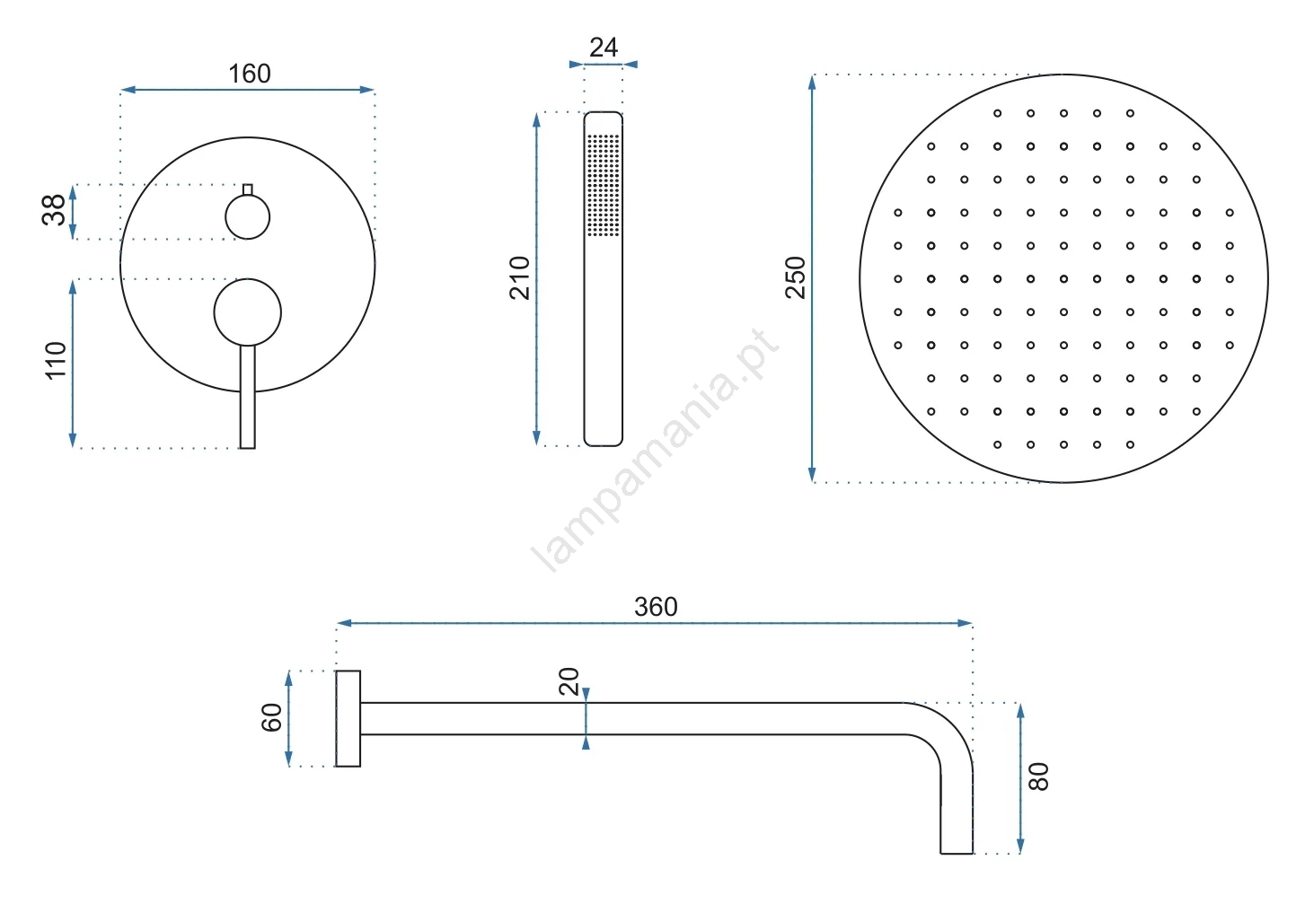 • Conteúdo da embalagem: caixa encastrada, misturador completo, braço, duche de mão e cabeça de duche, suporte para duche de mão, mangueira de 150 cm.