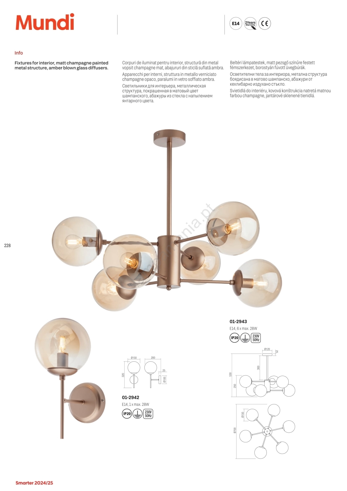 Redo 01-2943 - Candeeiro suspenso MUNDI 6xE14/28W/230V cobre caracteriza-se por um design agradável e funcional.  Uma lâmpada com casquilho E14 é adequada para a iluminação Aqui, pode comprar outras lâmpadas a preços vantajosos. Terá um complemento interessante para a sua casa.