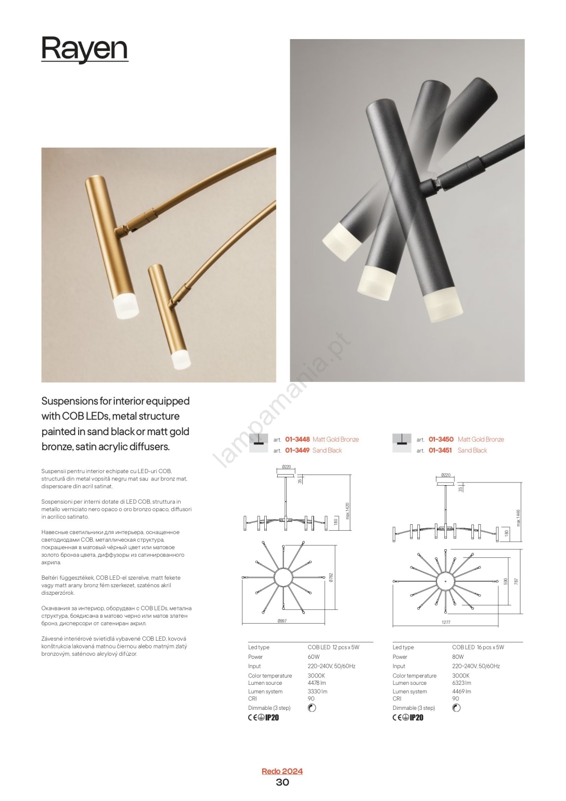 Redo 01-3450 - Lustre LED dimerizável em haste RAYEN LED/80W/230V CRI 90 dourado