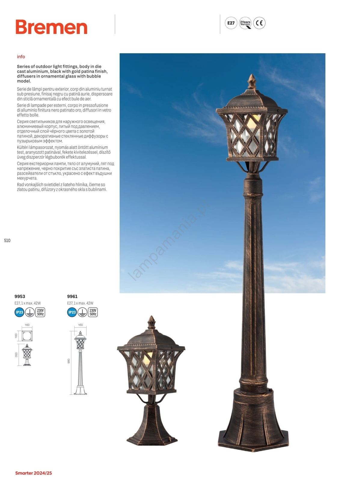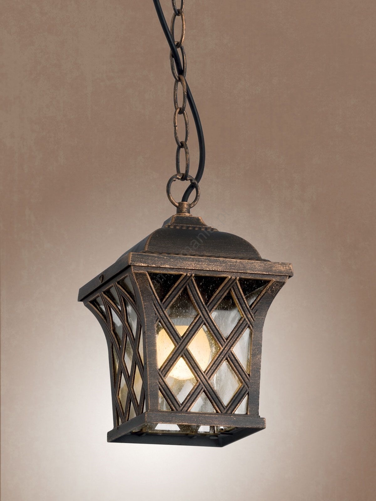 Redo 9952 - Candeeiro suspenso exterior BREMEN 1xE27/42W/230V IP23 dourado/pátina caracteriza-se por um design agradável e funcional.  Uma lâmpada com casquilho E27 é adequada para a iluminação Aqui, pode comprar outras lâmpadas a preços vantajosos. Terá um complemento interessante para a sua casa.
