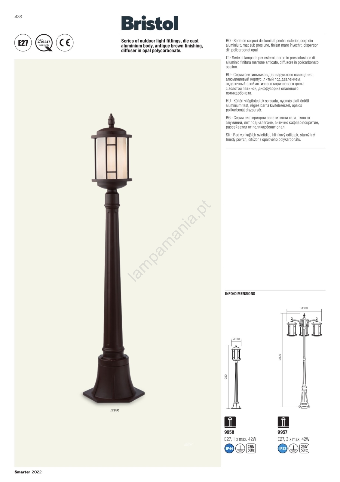 Redo 9956 - Candelabro suspenso exterior BRISTOL 1xE327/42W230V IP23 caracteriza-se por um design agradável e funcional.  Uma lâmpada com casquilho E27 é adequada para a iluminação Aqui, pode comprar outras lâmpadas a preços vantajosos. Terá um complemento interessante para a sua casa.