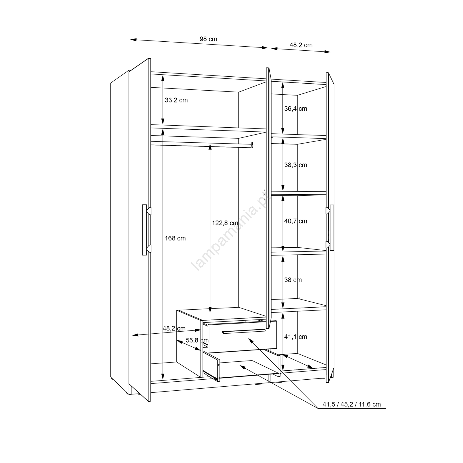 • O guarda-roupa dispõe de barra para cabides, gavetas, prateleiras e um amplo espaço de arrumação para as suas roupas, malas e artigos sazonais.