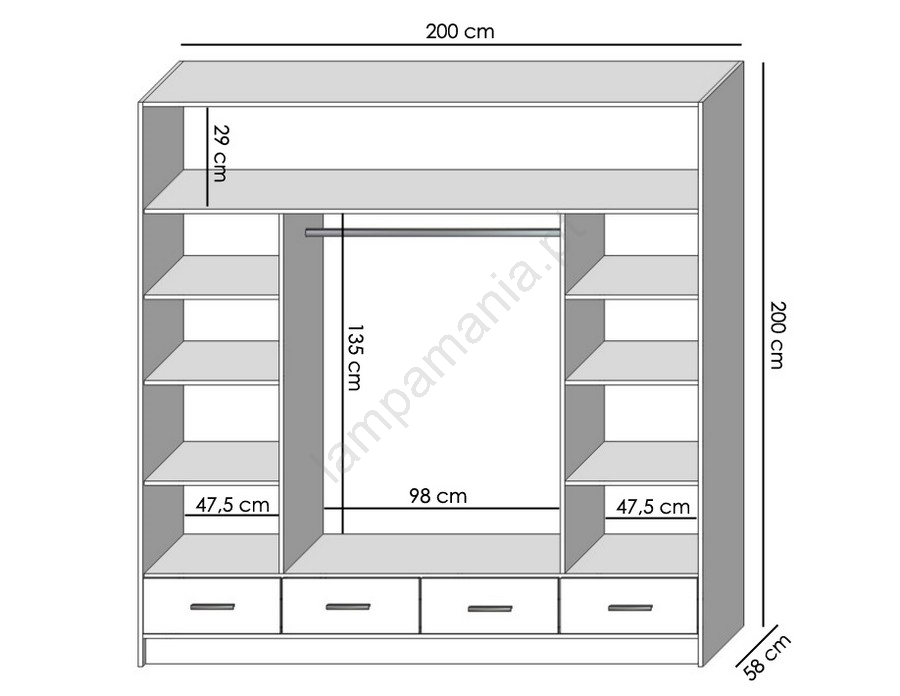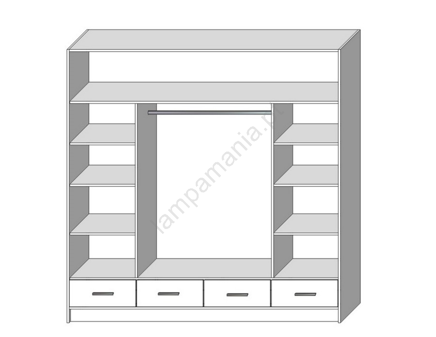 • O guarda-roupa possui 8 prateleiras abertas, 4 gavetas, uma barra para cabides e uma prateleira superior para guardar bolsas e itens sazonais.
