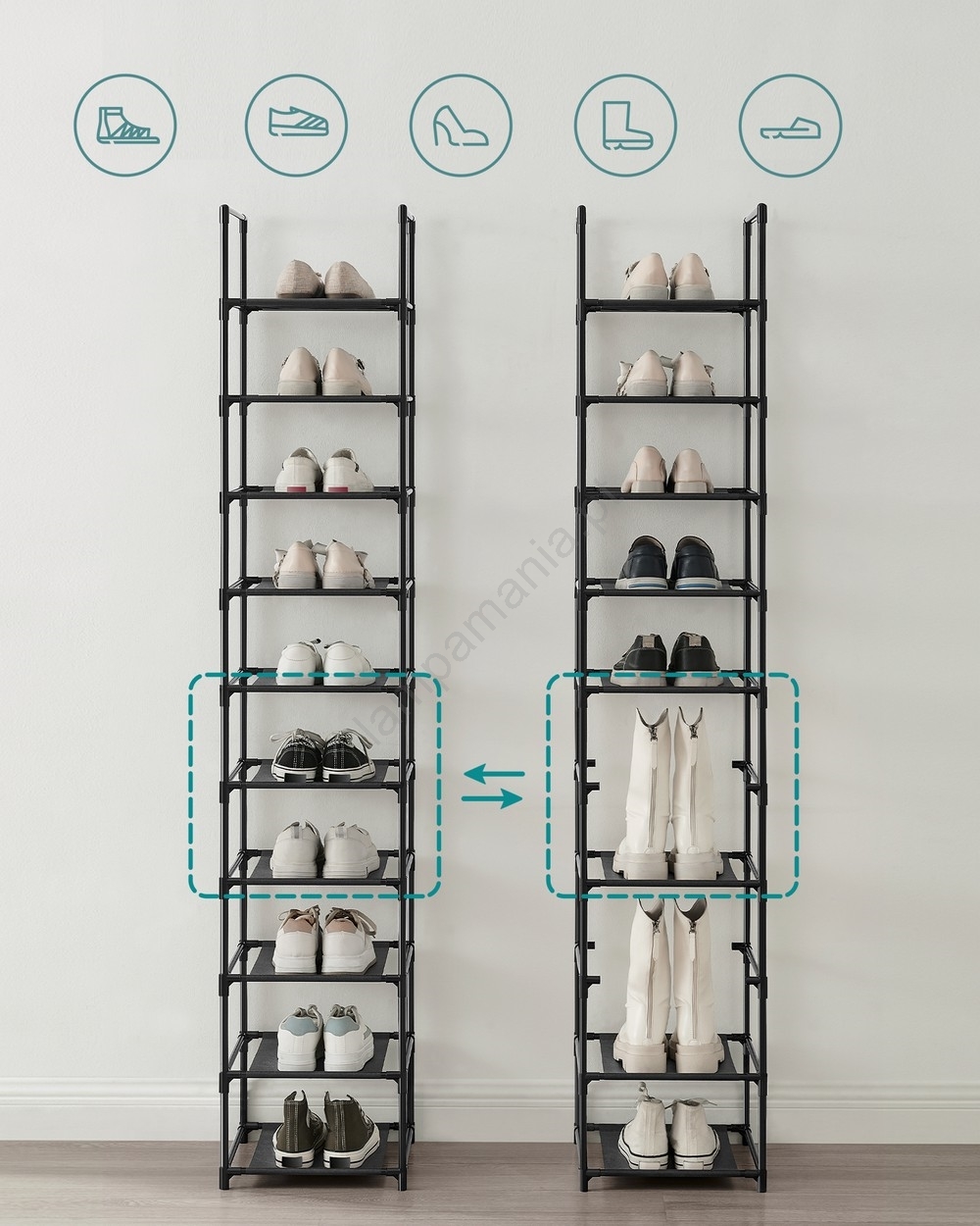 • Graças ao seu perfil esguio, esta sapateira de 10 prateleiras ocupa pouco espaço no chão e, ainda assim, oferece ampla capacidade de armazenamento.