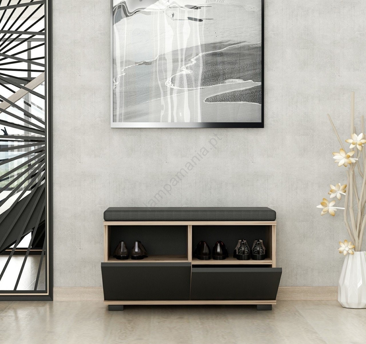 • Armário para sapatos com assento estofado confortável.