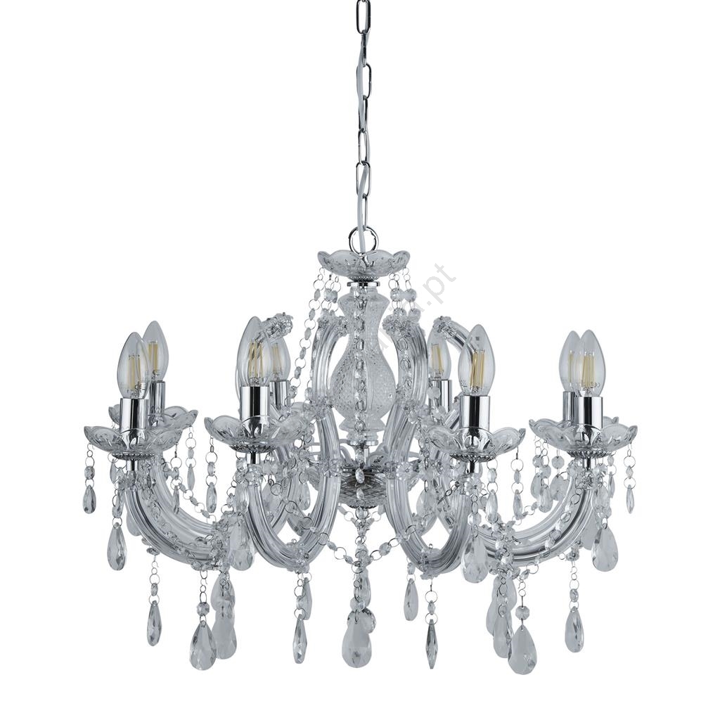 Searchlight - Candelabro de cristal de corrente MARIE 8xE14/40W/230V caracteriza-se por um design agradável e funcional.  Uma lâmpada com casquilho E14 é adequada para a iluminação Aqui, pode comprar outras lâmpadas a preços vantajosos. Terá um complemento interessante para a sua casa.