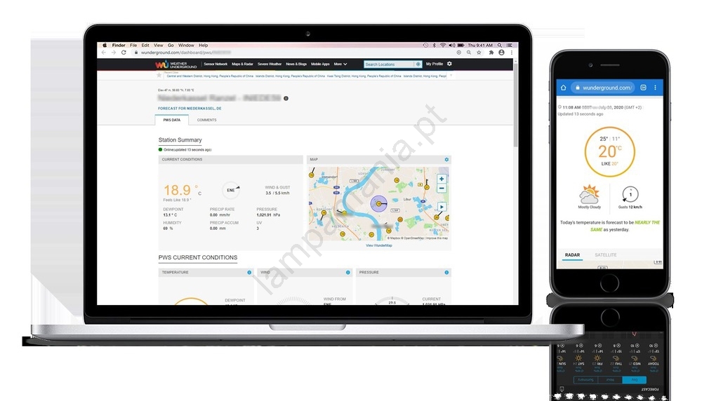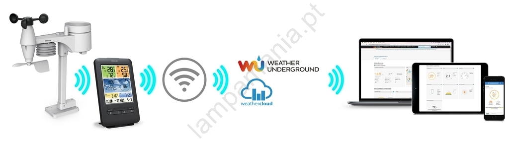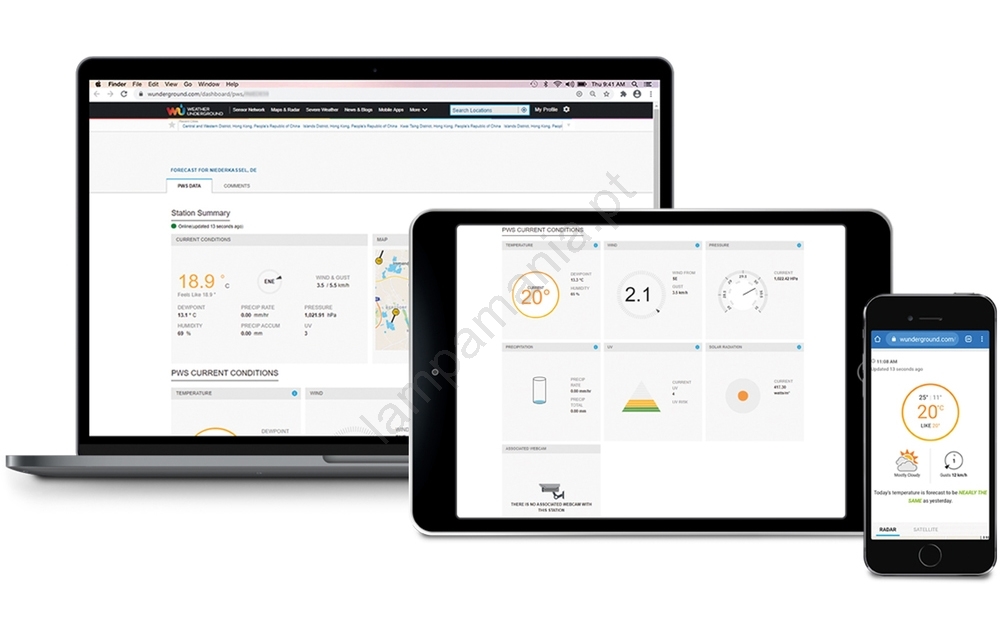 • Suporta dispositivos inteligentes, acesso online ao histórico, dados e plataformas meteorológicas públicas globais "Weather Underground" e "Weathercloud".