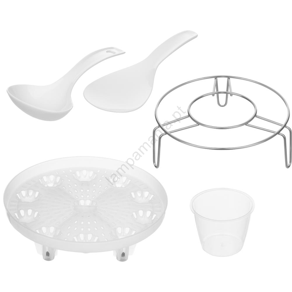 • Conteúdo da embalagem: panela de pressão com recipiente de 5,5 l, concha para arroz, colher para arroz, copo medidor, tripé metálico, acessório para cozimento a vapor.