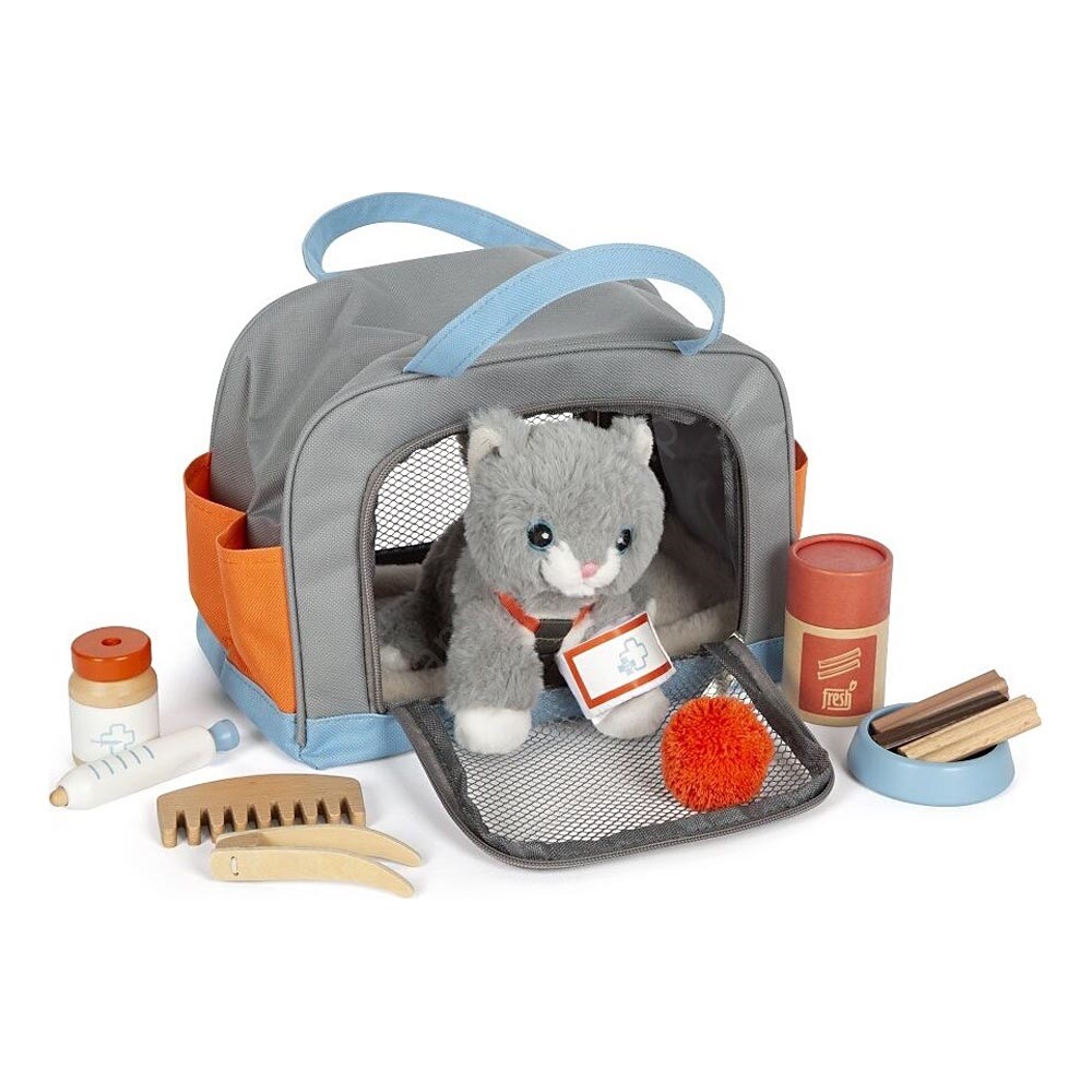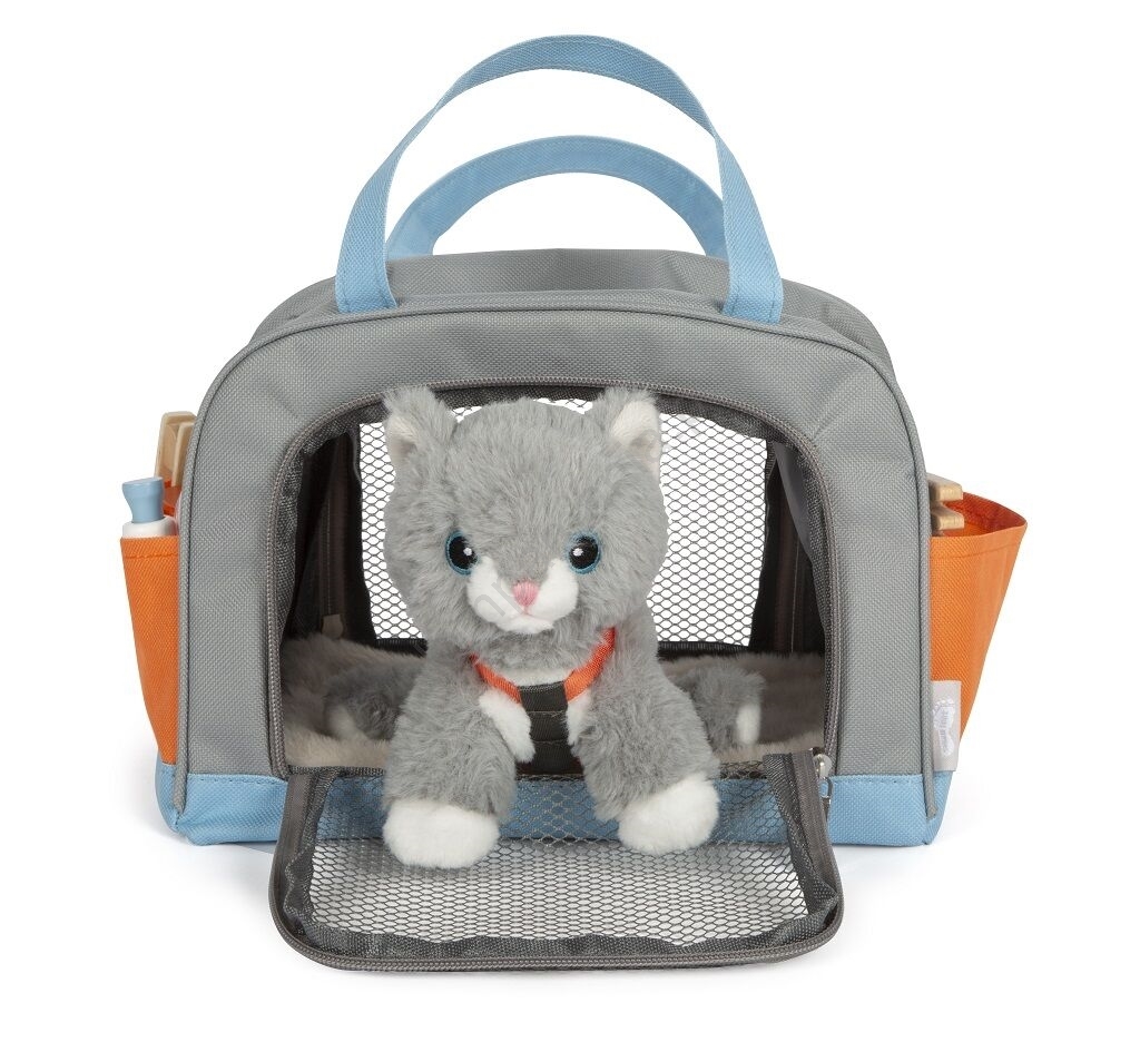 • O conjunto inclui: gato de pelúcia, bolsa de transporte com almofada, tigela, pote para petiscos, pinça, bandagem, caixa para remédios, brinquedo, escova e seringa com mecanismo de mola.
