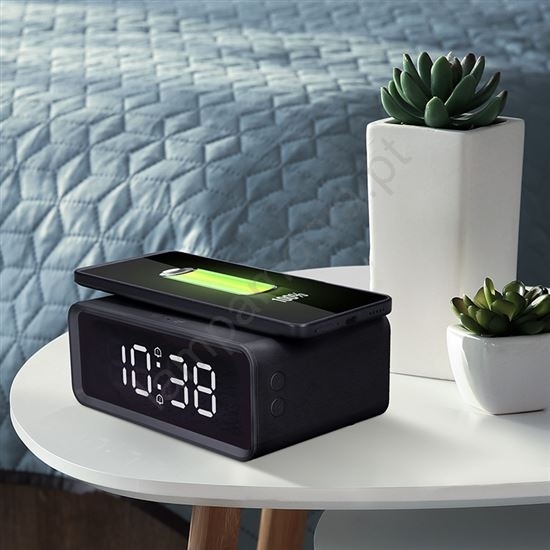Relógio digital com carregador sem fios Qi 230V/CR2032 preto
