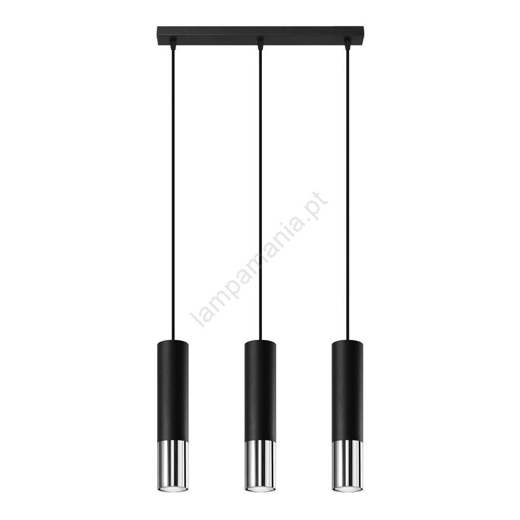Candeeiro suspenso LOOPEZ 3xGU10/10W/230V preto/cromado brilhante caracteriza-se por um design agradável e funcional.  Uma lâmpada com casquilho GU10 é adequada para a iluminação Aqui, pode comprar outras lâmpadas a preços vantajosos. Terá um complemento interessante para a sua casa.