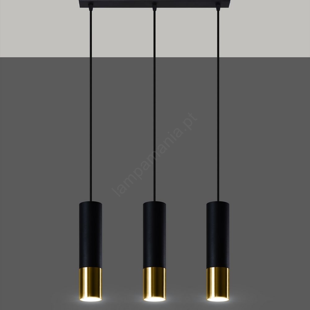 Candeeiro suspenso LOOPEZ 3xGU10/10W/230V preto/dourado caracteriza-se por um design agradável e funcional.  Uma lâmpada com casquilho GU10 é adequada para a iluminação Aqui, pode comprar outras lâmpadas a preços vantajosos. Terá um complemento interessante para a sua casa.