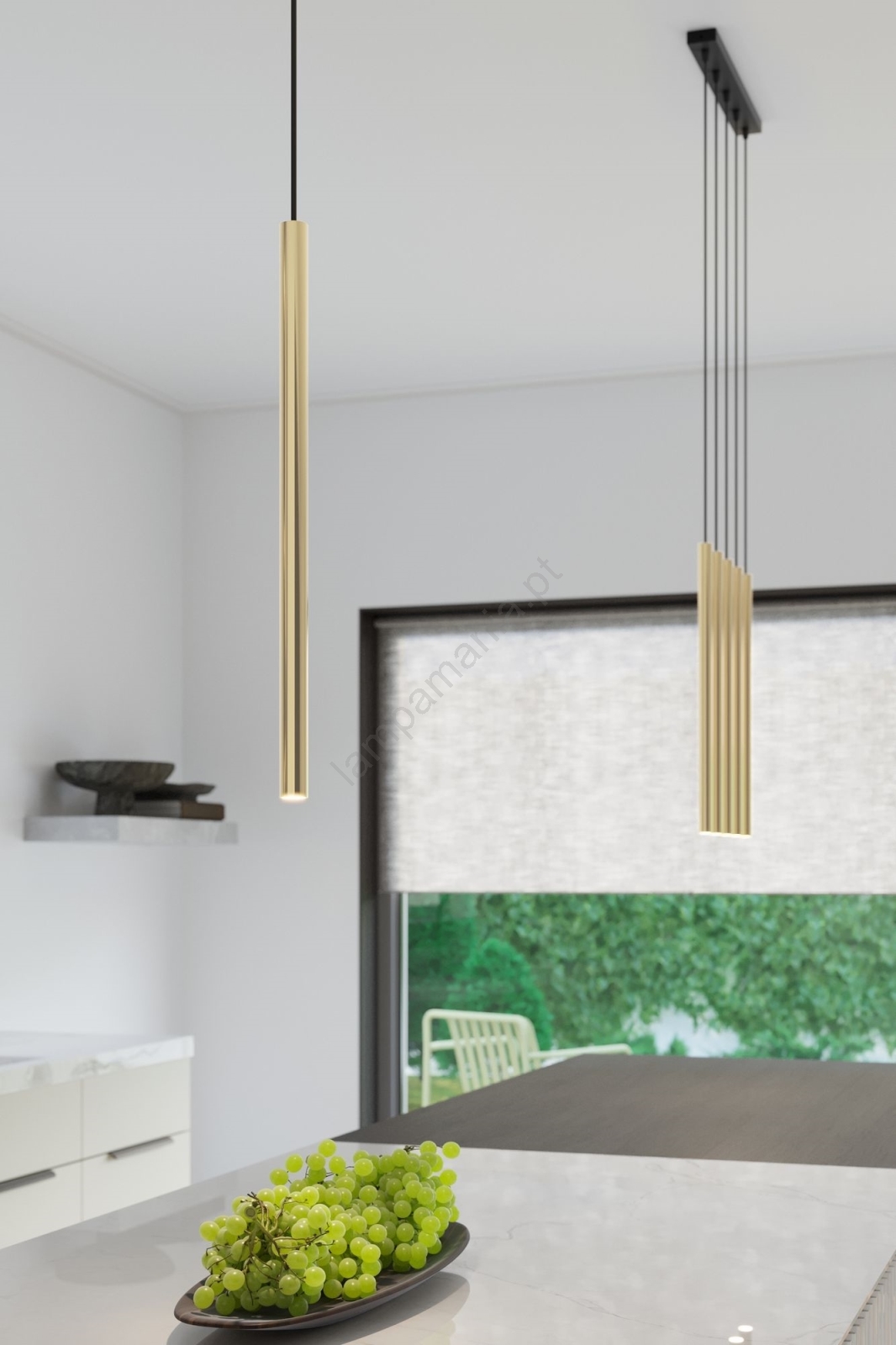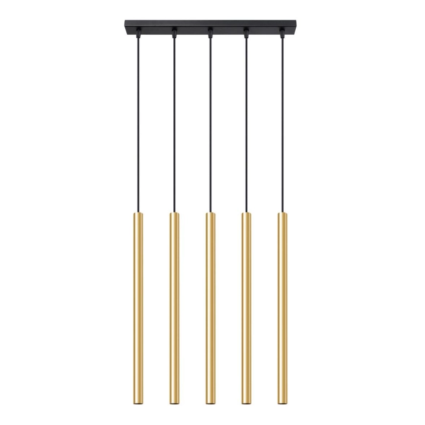 Candelabro suspenso PASTELO 5xG9/8W/230V dourada caracteriza-se por um design agradável e funcional.  Uma lâmpada com casquilho G9 é adequada para a iluminação Aqui, pode comprar outras lâmpadas a preços vantajosos. Terá um complemento interessante para a sua casa.
