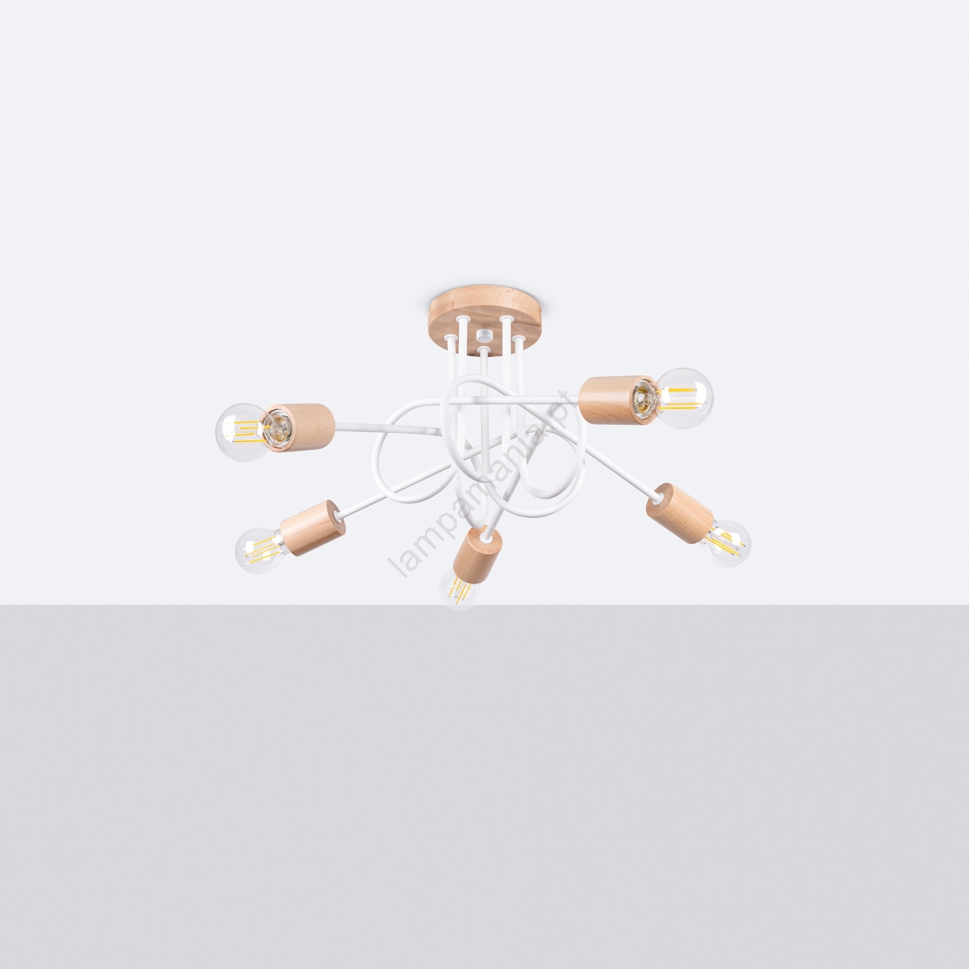 Candeeiro integrado EMBER 5xE27/15W/230V branco/bege/faia caracteriza-se por um design agradável e funcional.  Uma lâmpada com casquilho E27 é adequada para a iluminação Aqui, pode comprar outras lâmpadas a preços vantajosos. Terá um complemento interessante para a sua casa.