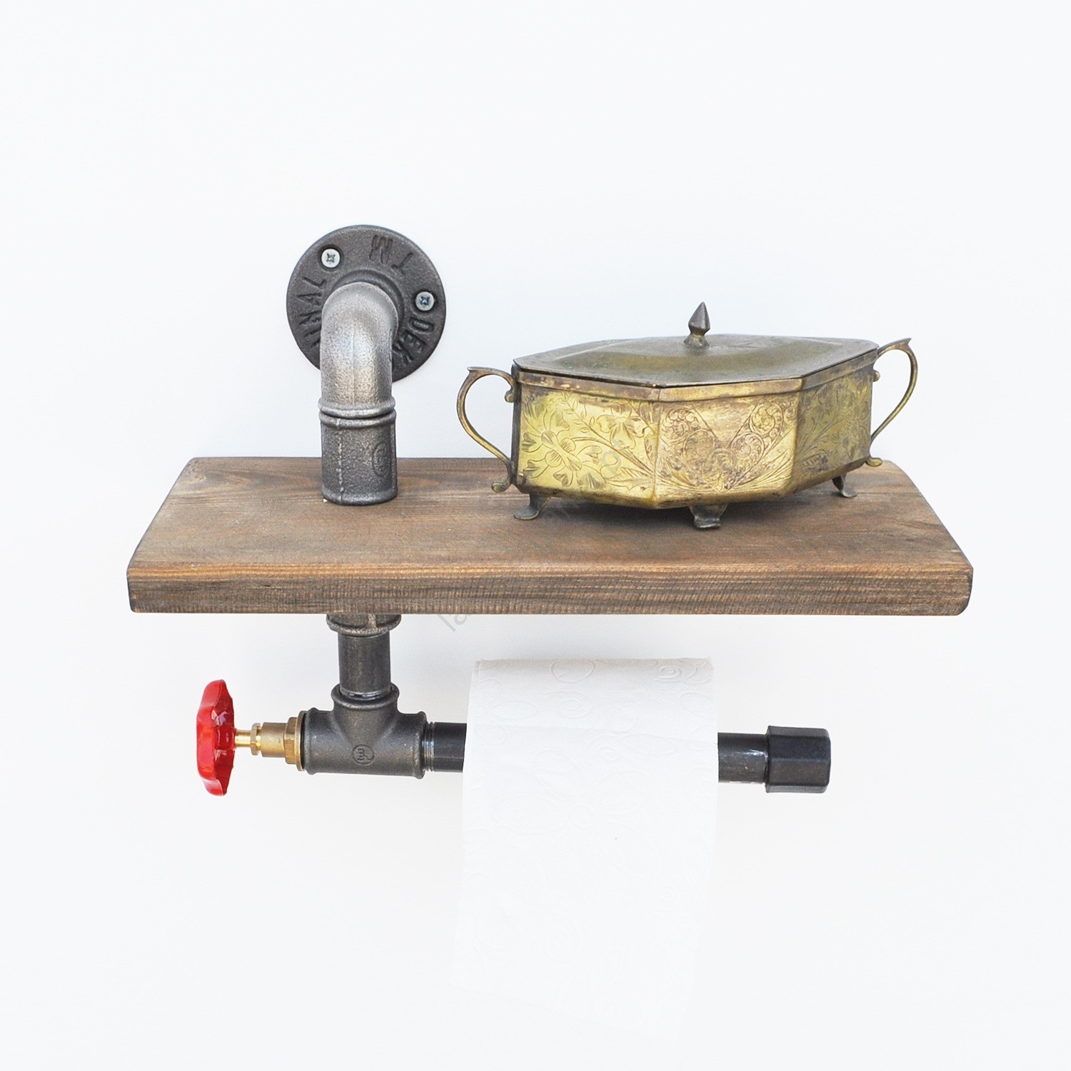 • Suporte para papel higiênico com prateleira de madeira de pinho em estilo industrial.