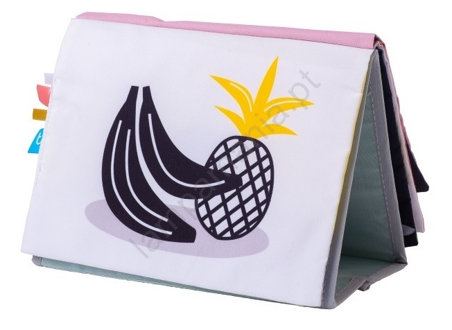 • O livro têxtil, com páginas rotativas em forma de calendário de secretária, oferece uma multiplicidade de imagens irresistíveis com texturas variadas, um espelho seguro, e um teether.