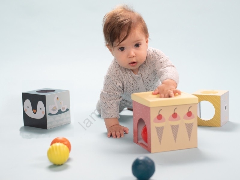 • Durante o jogo de bruços, a criança pode inserir a bola no orifício de um dos cubos.