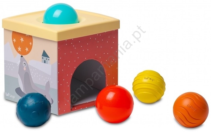 • Três bolas com texturas diferentes emitem um leve som de apito ao serem pressionadas e passam facilmente pelo orifício do cubo.