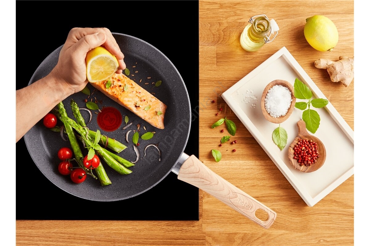 • Frigideira Tefal Natural Force com revestimento antiaderente Mineralia+ extremamente resistente, feito de minerais naturais, com cabo em imitação de madeira.