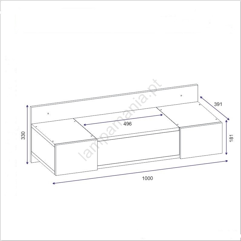 • Tem dois armários laterais e um compartimento de arrumação no meio.