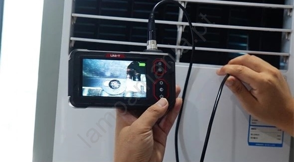 • Boroscópio industrial moderno com ecrã de grandes dimensões, destinado à inspeção de motores, tubulações, drenos, condutas ou cavidades em paredes de edifícios.