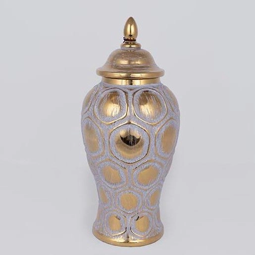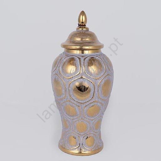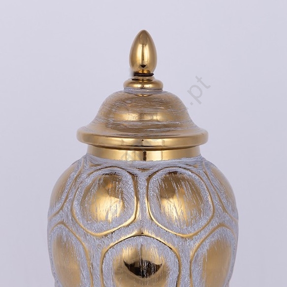 • A cor dourada realça os contornos do padrão e da tampa, conferindo ao vaso um visual luxuoso e sofisticado.