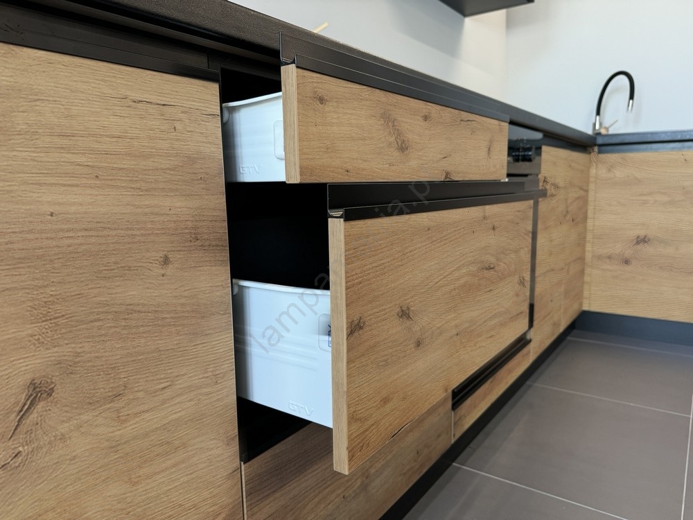 • Armários superiores estão equipados com pistões a gás, nas gavetas estão integradas de alta qualidade corrediças metálicas encapsuladas deslizantes.