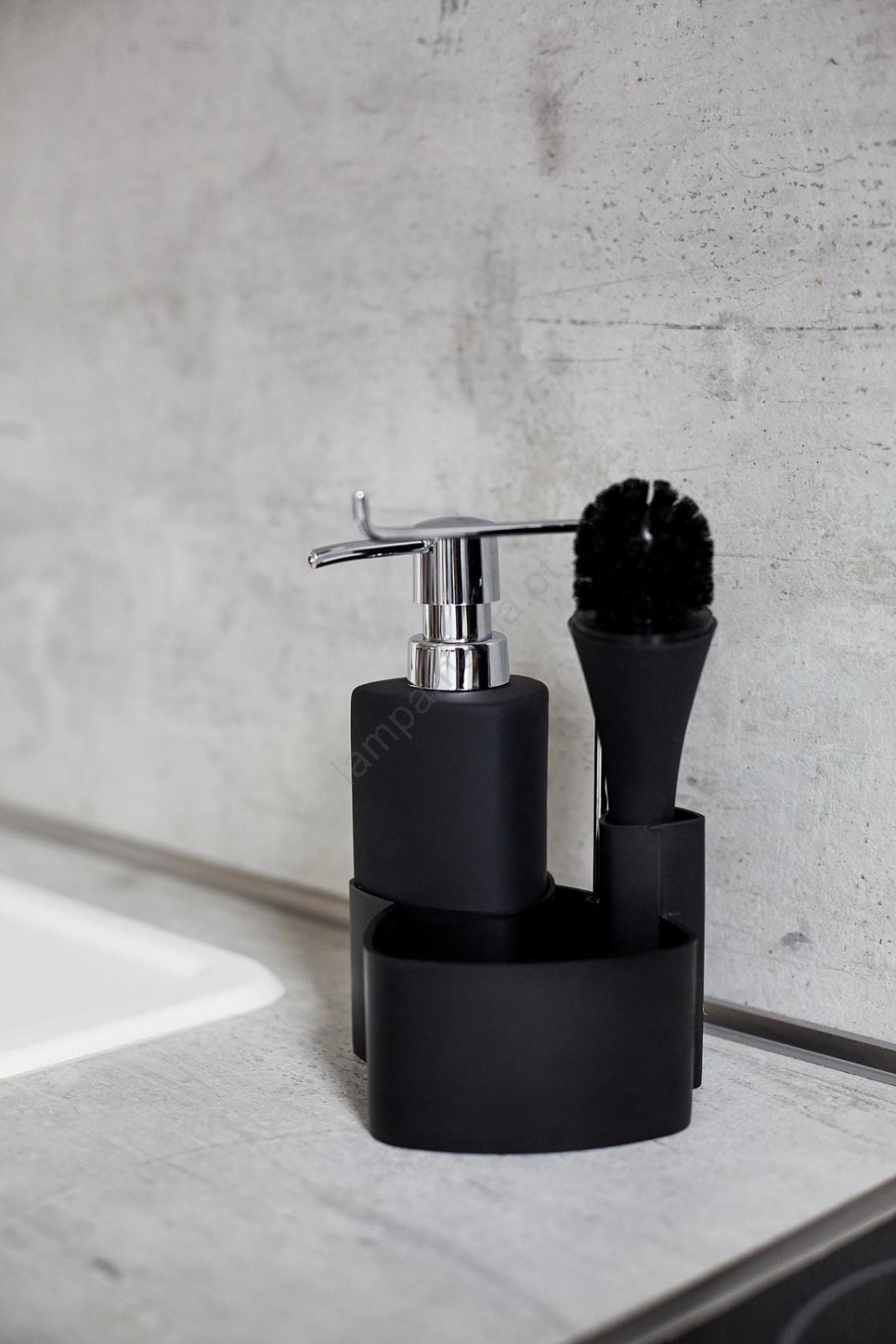 • Dispensador elegante para detergente ou sabão líquido em acabamento preto.