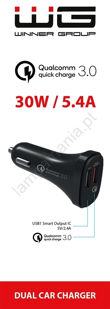 • Tensão de saída: DC 5V/3,1A (USB 1 - 2,4A/5V, USB 2 - Qualcomm Quick Charge 3.0).