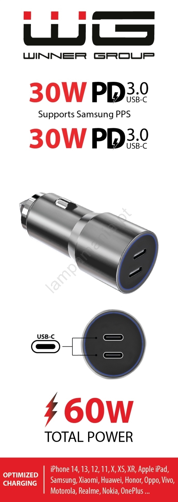 Winner Group - Carregador de carro 2xUSB-C Power Delivery 60W prateado